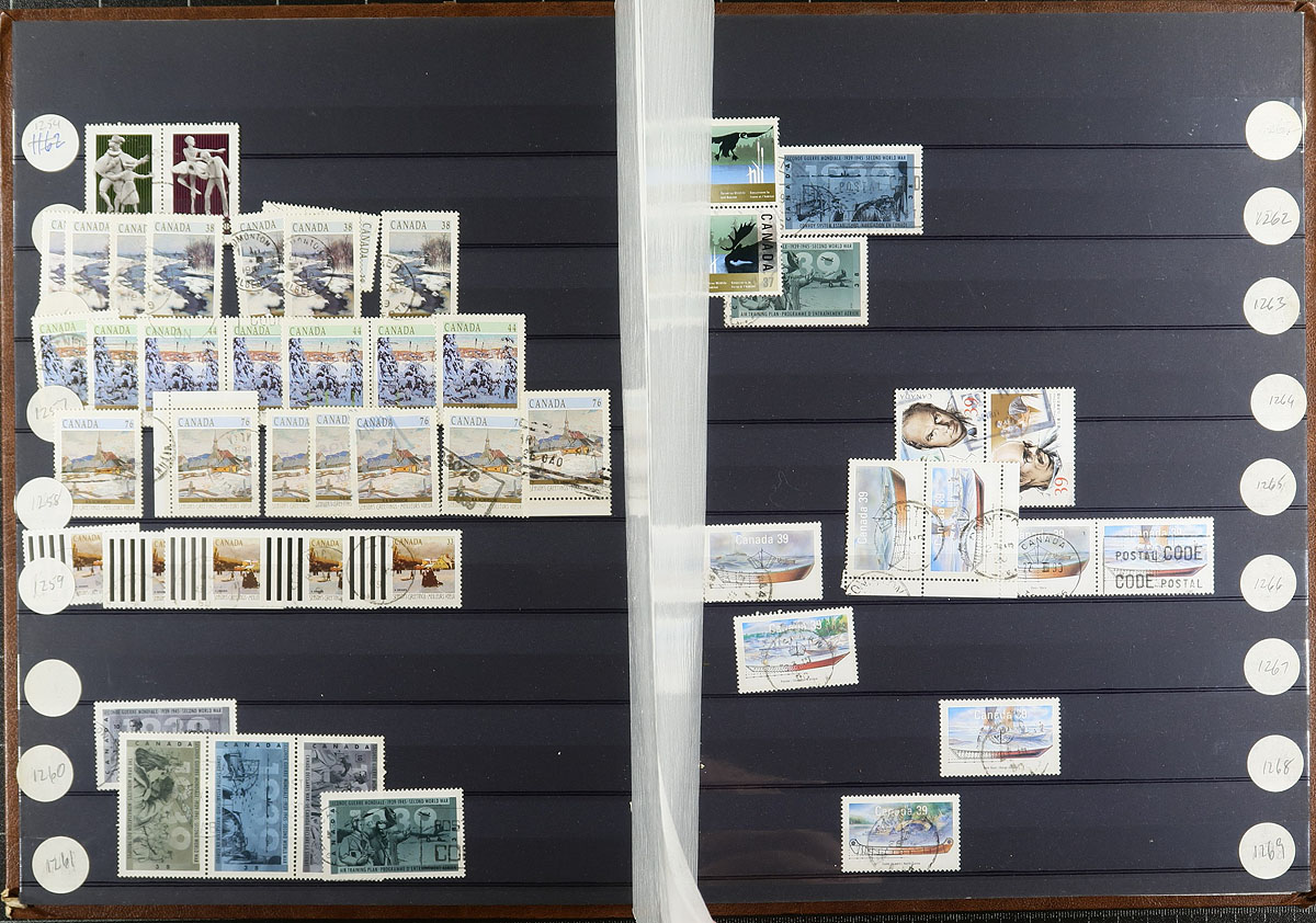 A bankers box with the balance of an estate in an assortment of albums, stockbooks and a good handful of loose pages, cards. Most of the collections are partial segments with some going back to #15 and others running into the 1990's. Some are mint, some are used, some are both. Some are collections, others were more "stock-like". We did see some higher cataloguing singles (e.g. Bluenose, 15c QV Jubilee) and there are a couple of jumbles of mint blocks that have potential. There could be some interesting cancels. A moderate amount of duplication is to be expected, as this material is from various sources. Some "back of the book" is scattered throughout. Estimate =