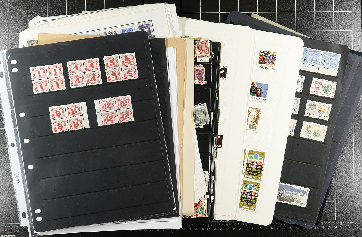 A bankers box with the balance of an estate in an assortment of albums, stockbooks and a good handful of loose pages, cards. Most of the collections are partial segments with some going back to #15 and others running into the 1990's. Some are mint, some are used, some are both. Some are collections, others were more "stock-like". We did see some higher cataloguing singles (e.g. Bluenose, 15c QV Jubilee) and there are a couple of jumbles of mint blocks that have potential. There could be some interesting cancels. A moderate amount of duplication is to be expected, as this material is from various sources. Some "back of the book" is scattered throughout. Estimate =