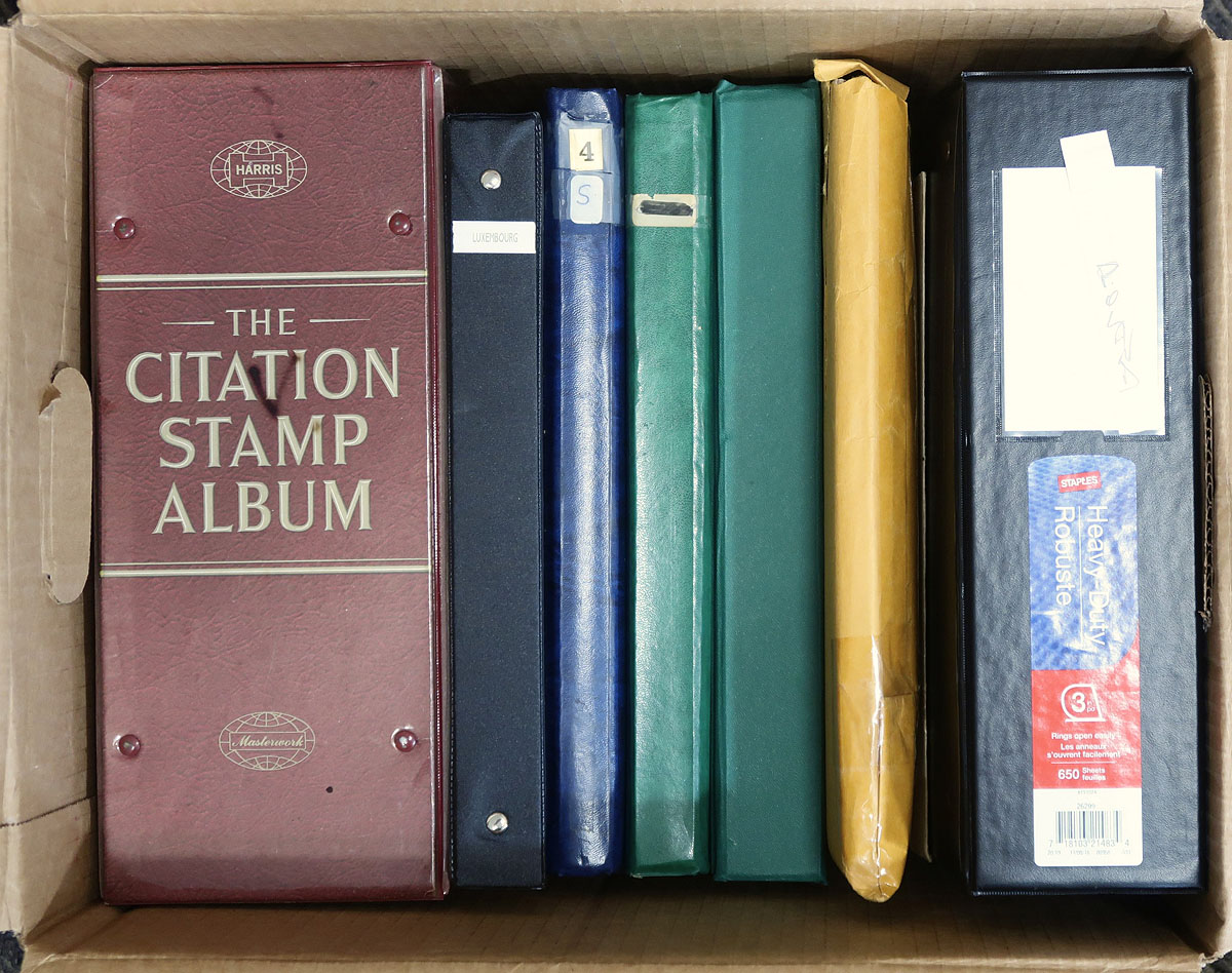A U-Haul box, about half is single country collections, the rest is a true worldwide offering. For the single countries we saw Poland (computer generated album pages to 2009, with 2600 different mostly used stamps). Bulgaria (on Scott Specialty pages and some stockpages), Luxembourg (computer generated pages to 1989), and a couple of stockbooks - one with Czechoslovakia, the other strong in Hungary. The worldwide includes a "Citation" album where the pages are falling apart because of love (and use) with many thousands of worldwide stamps. The box ends with a stockbook with a diverse range of worldwide: with stamps in good condition but the owner has rendered the album unusable with some errant scissor cuts. Estimate =