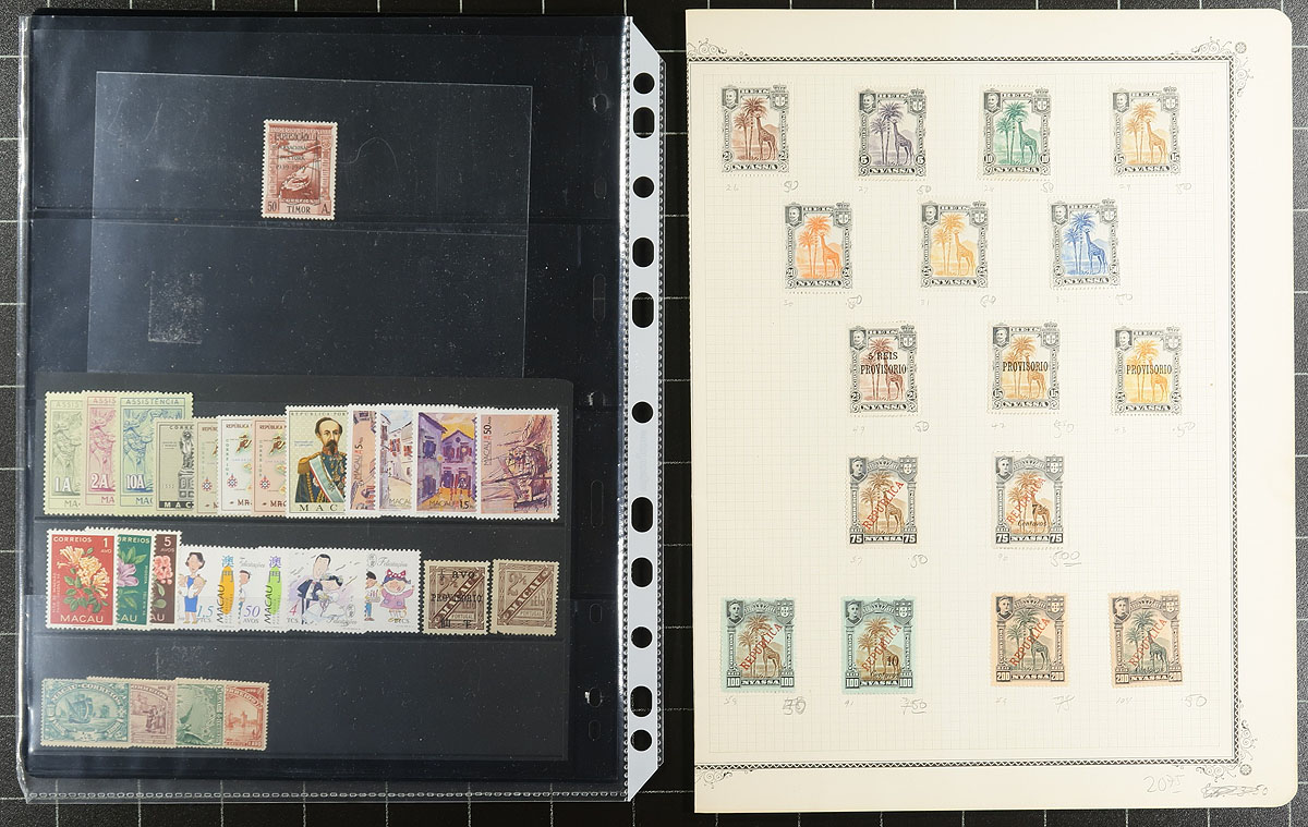 Macau, Timor and Nyassa, a mostly older assortment of sets and singles, mint and used, some mounted, some as purchased at auction such as the 1939 World’s Fair overprint from Timor. Includes some late 20th century mint Macau, with three souvenir sheets. The catalogue value will add up quickly here. Estimate =