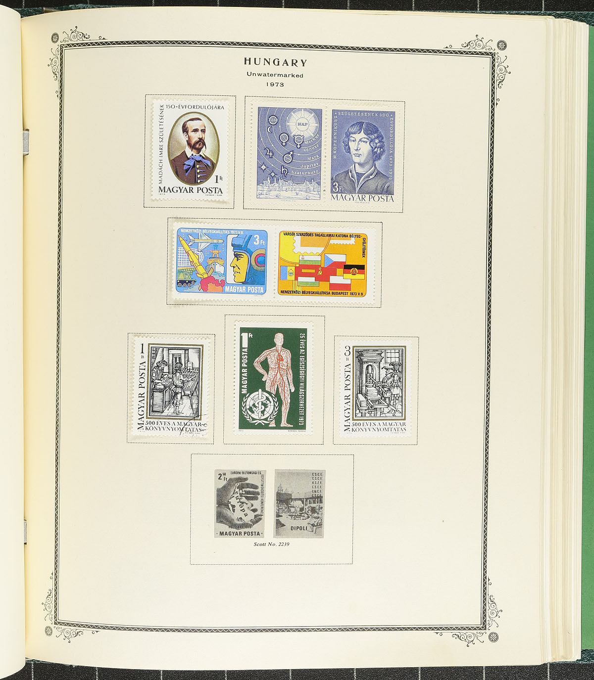 A pair of Scott Specialty Series, 2-post albums with pages from 1874 to 1983, containing over 2500 regular issues and souvenir sheets, plus another 900 back of the book, with strength in semi-postal, air mail and postage dues. The usual mix of mint (hinged and never hinged), used, cancelled to order, with a number of souvenir sheets. While none of the very expensive items are here, the quality is nice and with over 3400 items, the coverage is very comprehensive for the period. The retail value of the albums (if empty) is over $300.00. Estimate =
