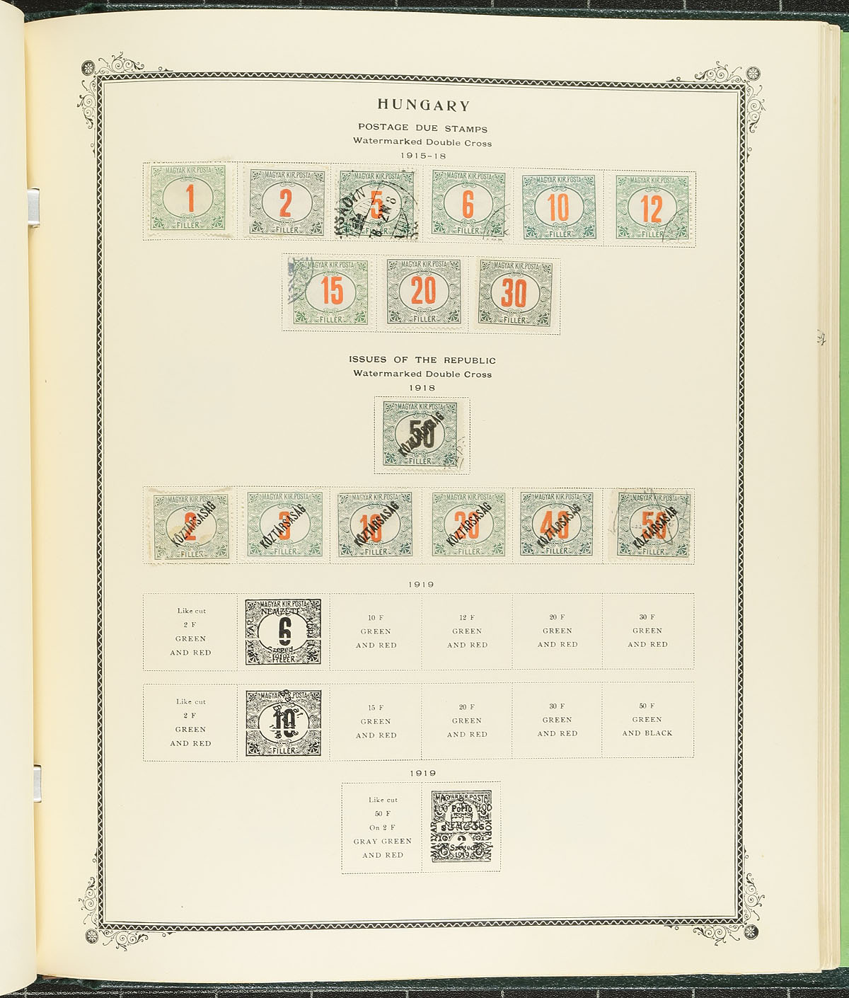 A pair of Scott Specialty Series, 2-post albums with pages from 1874 to 1983, containing over 2500 regular issues and souvenir sheets, plus another 900 back of the book, with strength in semi-postal, air mail and postage dues. The usual mix of mint (hinged and never hinged), used, cancelled to order, with a number of souvenir sheets. While none of the very expensive items are here, the quality is nice and with over 3400 items, the coverage is very comprehensive for the period. The retail value of the albums (if empty) is over $300.00. Estimate =