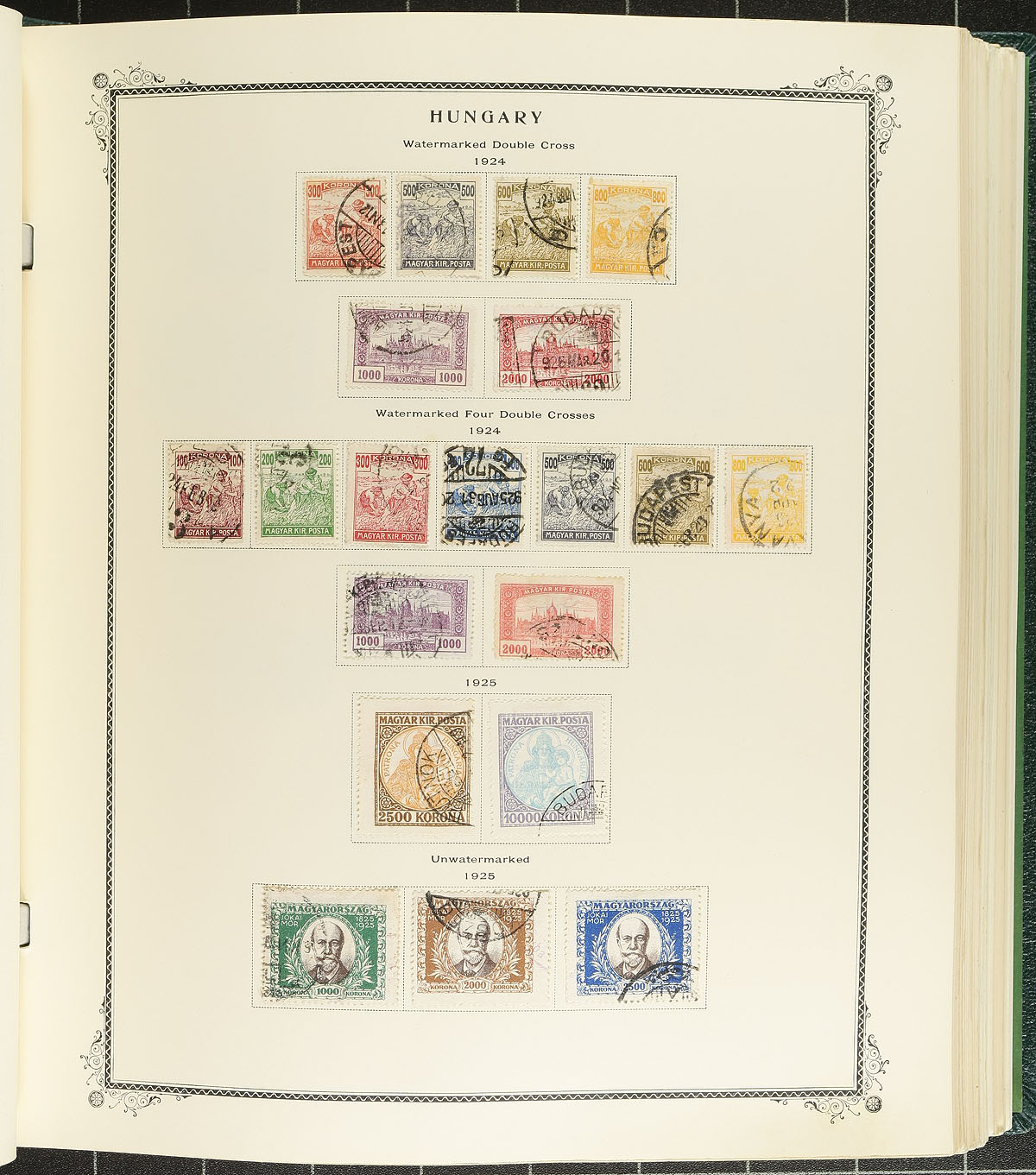 A pair of Scott Specialty Series, 2-post albums with pages from 1874 to 1983, containing over 2500 regular issues and souvenir sheets, plus another 900 back of the book, with strength in semi-postal, air mail and postage dues. The usual mix of mint (hinged and never hinged), used, cancelled to order, with a number of souvenir sheets. While none of the very expensive items are here, the quality is nice and with over 3400 items, the coverage is very comprehensive for the period. The retail value of the albums (if empty) is over $300.00. Estimate =