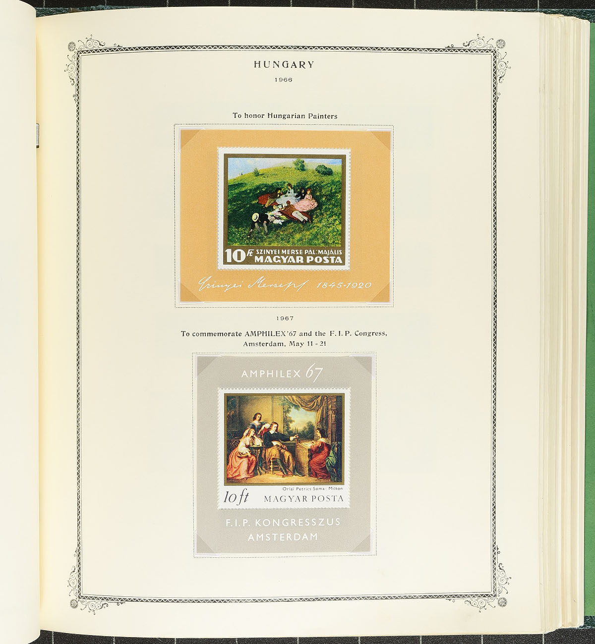 A pair of Scott Specialty Series, 2-post albums with pages from 1874 to 1983, containing over 2500 regular issues and souvenir sheets, plus another 900 back of the book, with strength in semi-postal, air mail and postage dues. The usual mix of mint (hinged and never hinged), used, cancelled to order, with a number of souvenir sheets. While none of the very expensive items are here, the quality is nice and with over 3400 items, the coverage is very comprehensive for the period. The retail value of the albums (if empty) is over $300.00. Estimate =