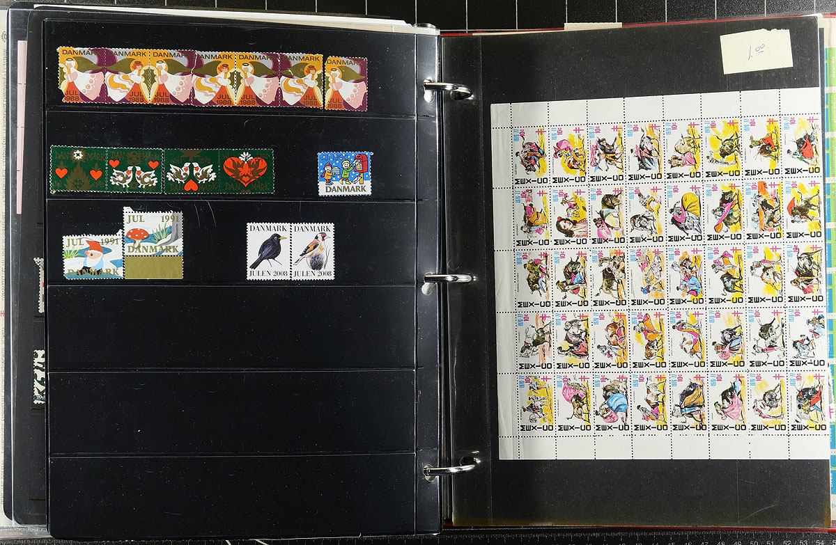 Cinderella Stamps. Bursting binder of Cinderellas, labels, forgeries, fantasies and revenues with a bit of ephemera. Strength in Canada and British Isles fund-raisers. There are 70 mint copies of Winnipeg "Canada Goose" revenue, including some strips of three with different perforations. 56 different Vancouver Silver Jubilee labels, Staffa, Lundy, an interesting "100 Centennial Dollars" from Victoria BC (1962), a letter "signed" by President Ford, plus the usual assortment of TB and Easter Seals from Canada, with some Mexico, Scandinavia, USA. Diverse. Estimate =