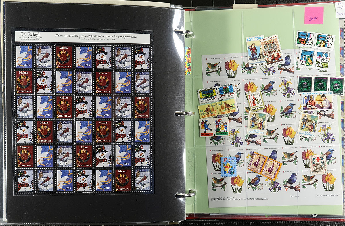 Cinderella Stamps. Bursting binder of Cinderellas, labels, forgeries, fantasies and revenues with a bit of ephemera. Strength in Canada and British Isles fund-raisers. There are 70 mint copies of Winnipeg "Canada Goose" revenue, including some strips of three with different perforations. 56 different Vancouver Silver Jubilee labels, Staffa, Lundy, an interesting "100 Centennial Dollars" from Victoria BC (1962), a letter "signed" by President Ford, plus the usual assortment of TB and Easter Seals from Canada, with some Mexico, Scandinavia, USA. Diverse. Estimate =