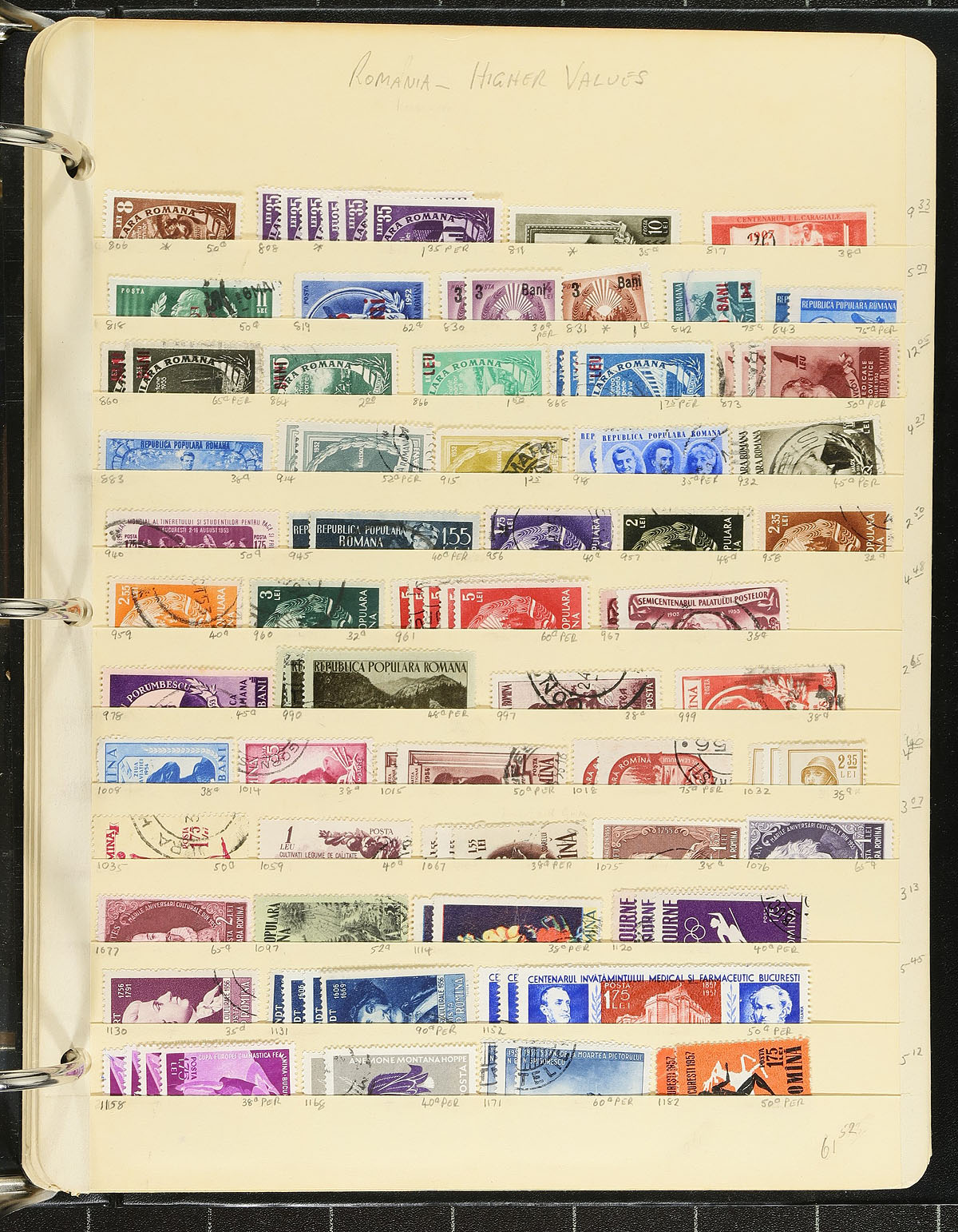 Three Eastern European country accumulations on stock and album pages. Two binders are Romania, one is 20th century Russia/USSR and the thinner binder contains Hungary. A mix of mint and used, with some back of the book and souvenir sheets. Light duplication throughout. A bit chaotic in its organization, so better items may lurk. Easily over 5,000 stamps here. Estimate =