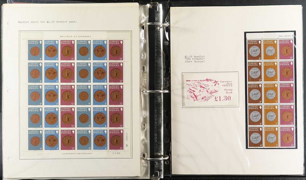 A three-binder quartet of mint Guernsey with a mix of collections (1969-85 in a "Collecta" album), a binder of never hinged (and lightly duplicated) booklets up to 1983 (17 are Guernsey, 37 are Jersey). There is a specialized group of the 1979-1980 "Coins" with booklets, panes, sheetlets (face value alone is £43.00). The final group is the 2002 Circus issue in singles, presentation folder, commemorative panes of 10 - difficult to find and face £28.20). A nice accumulation. Estimate =