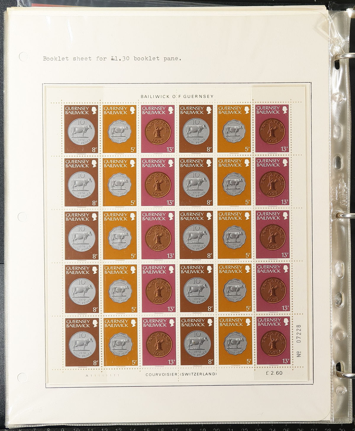 A three-binder quartet of mint Guernsey with a mix of collections (1969-85 in a "Collecta" album), a binder of never hinged (and lightly duplicated) booklets up to 1983 (17 are Guernsey, 37 are Jersey). There is a specialized group of the 1979-1980 "Coins" with booklets, panes, sheetlets (face value alone is £43.00). The final group is the 2002 Circus issue in singles, presentation folder, commemorative panes of 10 - difficult to find and face £28.20). A nice accumulation. Estimate =