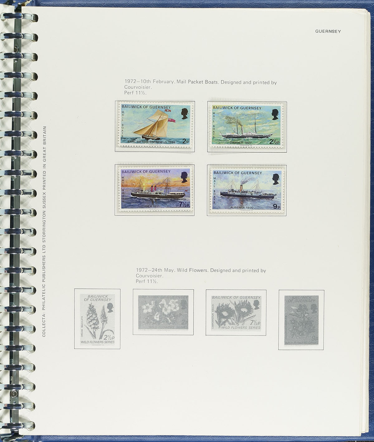 A three-binder quartet of mint Guernsey with a mix of collections (1969-85 in a "Collecta" album), a binder of never hinged (and lightly duplicated) booklets up to 1983 (17 are Guernsey, 37 are Jersey). There is a specialized group of the 1979-1980 "Coins" with booklets, panes, sheetlets (face value alone is £43.00). The final group is the 2002 Circus issue in singles, presentation folder, commemorative panes of 10 - difficult to find and face £28.20). A nice accumulation. Estimate =