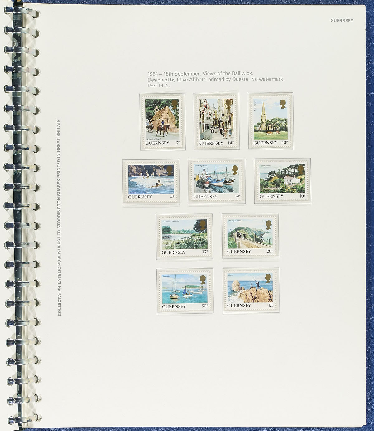 A three-binder quartet of mint Guernsey with a mix of collections (1969-85 in a "Collecta" album), a binder of never hinged (and lightly duplicated) booklets up to 1983 (17 are Guernsey, 37 are Jersey). There is a specialized group of the 1979-1980 "Coins" with booklets, panes, sheetlets (face value alone is £43.00). The final group is the 2002 Circus issue in singles, presentation folder, commemorative panes of 10 - difficult to find and face £28.20). A nice accumulation. Estimate =