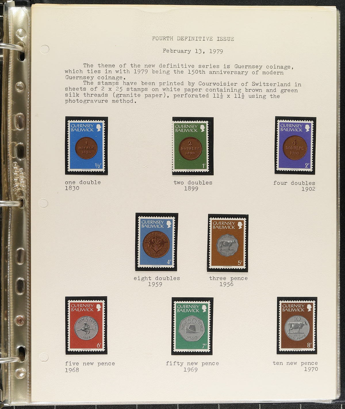 A three-binder quartet of mint Guernsey with a mix of collections (1969-85 in a "Collecta" album), a binder of never hinged (and lightly duplicated) booklets up to 1983 (17 are Guernsey, 37 are Jersey). There is a specialized group of the 1979-1980 "Coins" with booklets, panes, sheetlets (face value alone is £43.00). The final group is the 2002 Circus issue in singles, presentation folder, commemorative panes of 10 - difficult to find and face £28.20). A nice accumulation. Estimate =