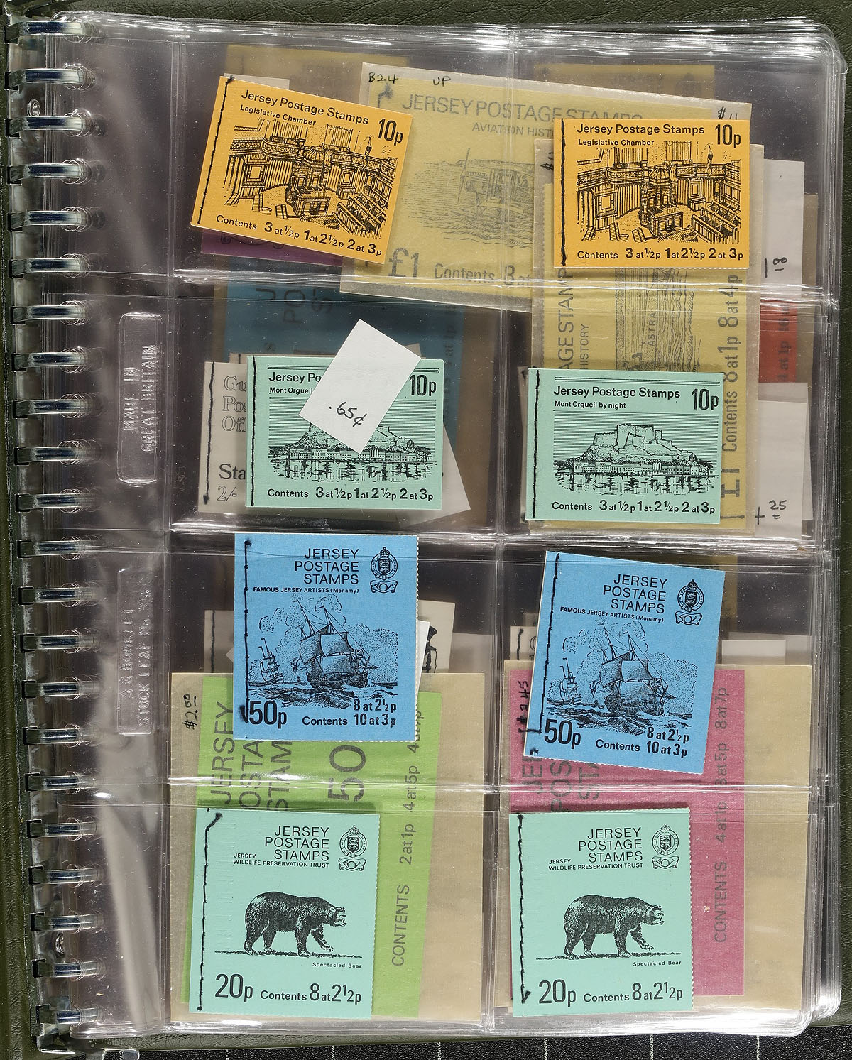 A three-binder quartet of mint Guernsey with a mix of collections (1969-85 in a "Collecta" album), a binder of never hinged (and lightly duplicated) booklets up to 1983 (17 are Guernsey, 37 are Jersey). There is a specialized group of the 1979-1980 "Coins" with booklets, panes, sheetlets (face value alone is £43.00). The final group is the 2002 Circus issue in singles, presentation folder, commemorative panes of 10 - difficult to find and face £28.20). A nice accumulation. Estimate =