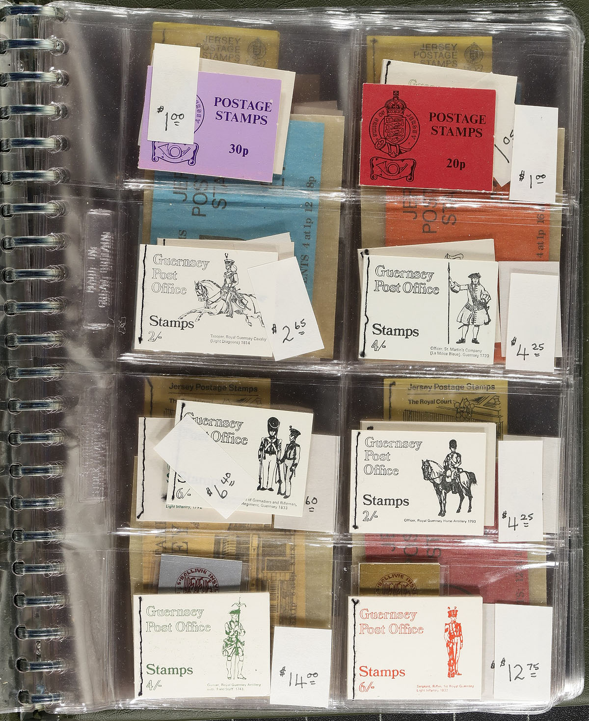 A three-binder quartet of mint Guernsey with a mix of collections (1969-85 in a "Collecta" album), a binder of never hinged (and lightly duplicated) booklets up to 1983 (17 are Guernsey, 37 are Jersey). There is a specialized group of the 1979-1980 "Coins" with booklets, panes, sheetlets (face value alone is £43.00). The final group is the 2002 Circus issue in singles, presentation folder, commemorative panes of 10 - difficult to find and face £28.20). A nice accumulation. Estimate =
