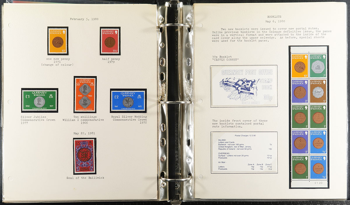 A three-binder quartet of mint Guernsey with a mix of collections (1969-85 in a "Collecta" album), a binder of never hinged (and lightly duplicated) booklets up to 1983 (17 are Guernsey, 37 are Jersey). There is a specialized group of the 1979-1980 "Coins" with booklets, panes, sheetlets (face value alone is £43.00). The final group is the 2002 Circus issue in singles, presentation folder, commemorative panes of 10 - difficult to find and face £28.20). A nice accumulation. Estimate =
