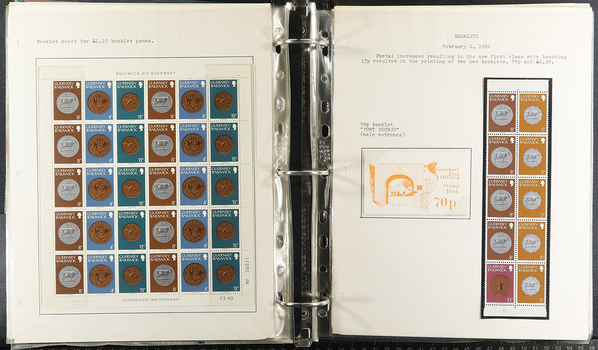 A three-binder quartet of mint Guernsey with a mix of collections (1969-85 in a "Collecta" album), a binder of never hinged (and lightly duplicated) booklets up to 1983 (17 are Guernsey, 37 are Jersey). There is a specialized group of the 1979-1980 "Coins" with booklets, panes, sheetlets (face value alone is £43.00). The final group is the 2002 Circus issue in singles, presentation folder, commemorative panes of 10 - difficult to find and face £28.20). A nice accumulation. Estimate =