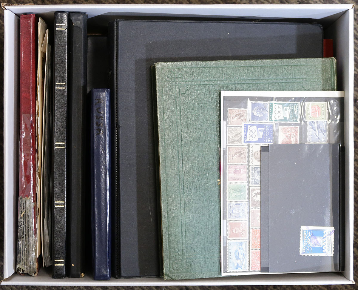 An estate balance, filling a bankers box. A mix of single and multi-country offerings, perfect for the philatelic hunter. There are a couple of older world-wide collections ("Modern" and "Strand" albums), a page of mint Australia, a few damaged used Scandinavia (with a faulty Greenland polar bear "#Q4a, cat $550.00!). A mostly modern study of post office cancels from Rhodesia/Zimbabwe has some potential, as does a few loose pages of India and New Zealand. There is a stockbook with Vatican City, some turn of the millennium CTO souvenir sheets and mini-sheets from Mozambique and a bit of China, Europe and Africa on loose pages. Estimate =