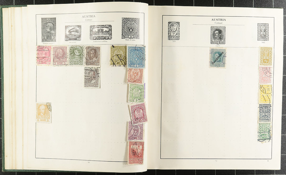 An estate balance, filling a bankers box. A mix of single and multi-country offerings, perfect for the philatelic hunter. There are a couple of older world-wide collections ("Modern" and "Strand" albums), a page of mint Australia, a few damaged used Scandinavia (with a faulty Greenland polar bear "#Q4a, cat $550.00!). A mostly modern study of post office cancels from Rhodesia/Zimbabwe has some potential, as does a few loose pages of India and New Zealand. There is a stockbook with Vatican City, some turn of the millennium CTO souvenir sheets and mini-sheets from Mozambique and a bit of China, Europe and Africa on loose pages. Estimate =