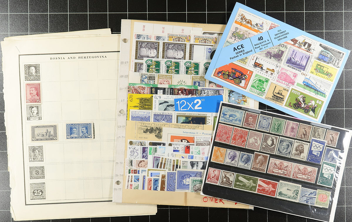 An estate balance, filling a bankers box. A mix of single and multi-country offerings, perfect for the philatelic hunter. There are a couple of older world-wide collections ("Modern" and "Strand" albums), a page of mint Australia, a few damaged used Scandinavia (with a faulty Greenland polar bear "#Q4a, cat $550.00!). A mostly modern study of post office cancels from Rhodesia/Zimbabwe has some potential, as does a few loose pages of India and New Zealand. There is a stockbook with Vatican City, some turn of the millennium CTO souvenir sheets and mini-sheets from Mozambique and a bit of China, Europe and Africa on loose pages. Estimate =
