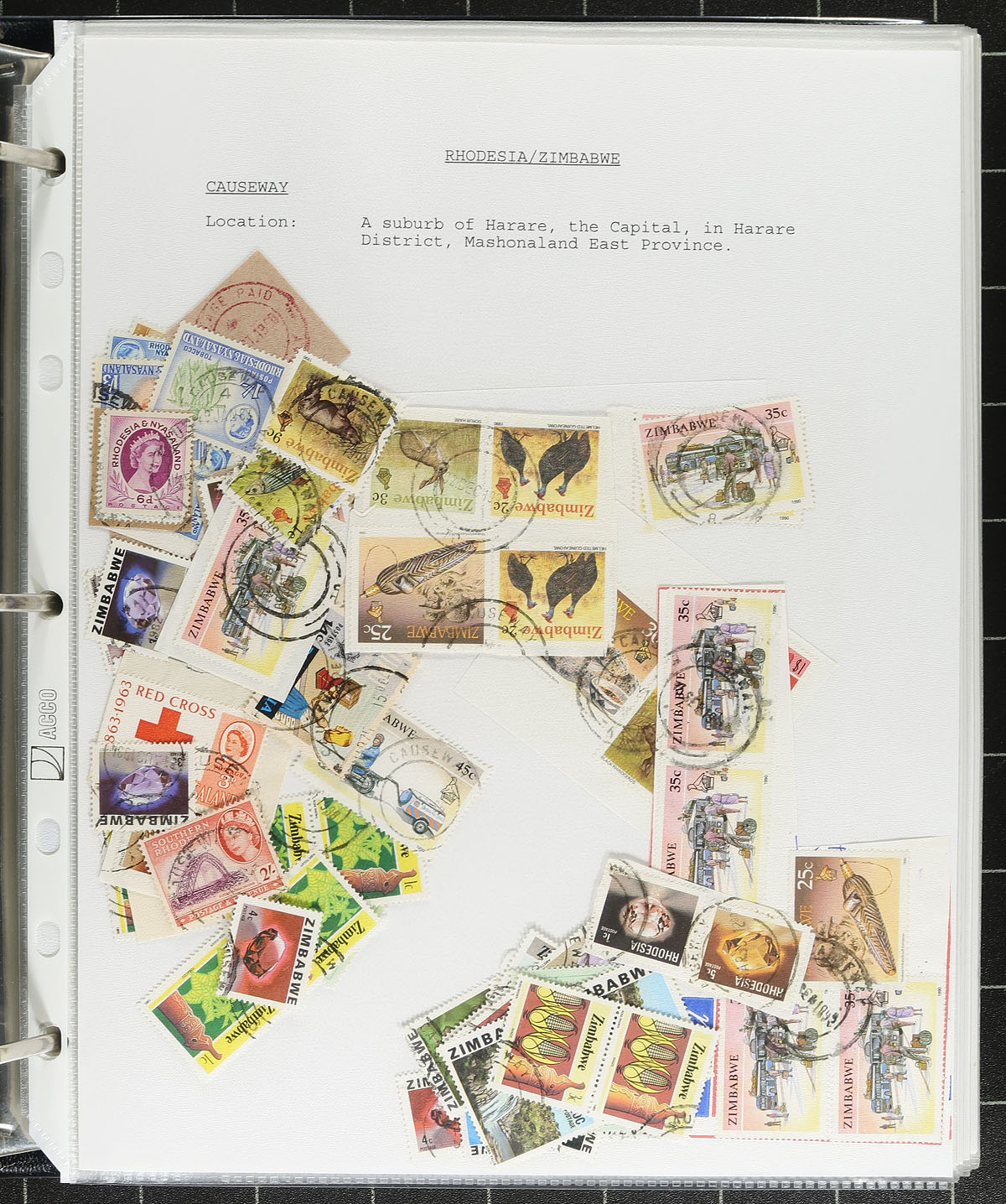 An estate balance, filling a bankers box. A mix of single and multi-country offerings, perfect for the philatelic hunter. There are a couple of older world-wide collections ("Modern" and "Strand" albums), a page of mint Australia, a few damaged used Scandinavia (with a faulty Greenland polar bear "#Q4a, cat $550.00!). A mostly modern study of post office cancels from Rhodesia/Zimbabwe has some potential, as does a few loose pages of India and New Zealand. There is a stockbook with Vatican City, some turn of the millennium CTO souvenir sheets and mini-sheets from Mozambique and a bit of China, Europe and Africa on loose pages. Estimate =