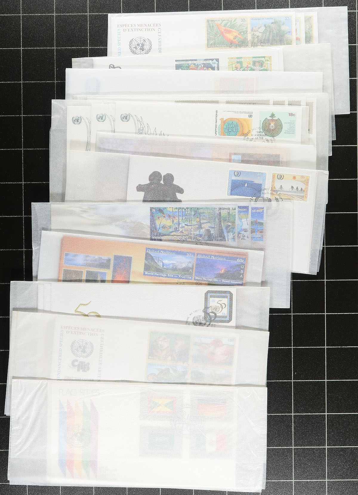 All different UN Philatelic Agency cachet First Day Cover assortment, from all three offices, ranging from 1981-2005. Lots of trios and complete sets and a few of the larger format first day covers. All unaddressed and most are still in their original glassines and have never been touched by collector hands. The original cost of these was several hundred US dollars (fills a small box). We don’t see much UN from the past 25 years. Estimate =