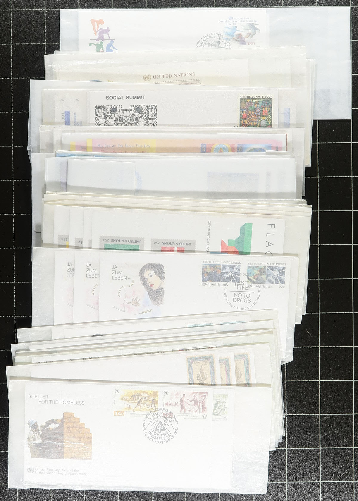 All different UN Philatelic Agency cachet First Day Cover assortment, from all three offices, ranging from 1981-2005. Lots of trios and complete sets and a few of the larger format first day covers. All unaddressed and most are still in their original glassines and have never been touched by collector hands. The original cost of these was several hundred US dollars (fills a small box). We don’t see much UN from the past 25 years. Estimate =