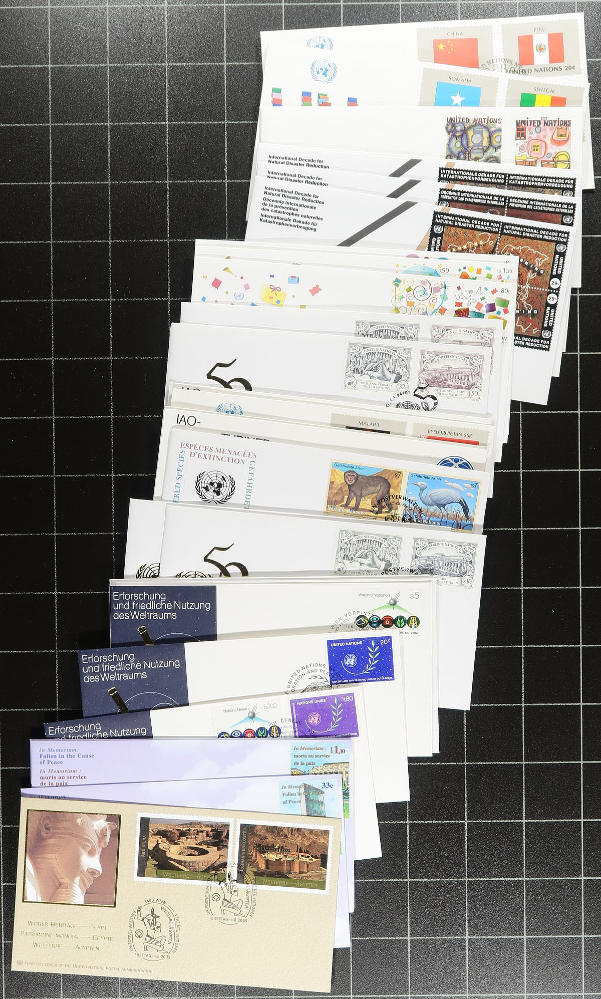 All different UN Philatelic Agency cachet First Day Cover assortment, from all three offices, ranging from 1981-2005. Lots of trios and complete sets and a few of the larger format first day covers. All unaddressed and most are still in their original glassines and have never been touched by collector hands. The original cost of these was several hundred US dollars (fills a small box). We don’t see much UN from the past 25 years. Estimate =