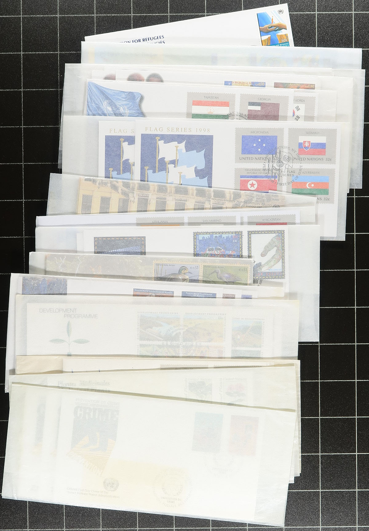 All different UN Philatelic Agency cachet First Day Cover assortment, from all three offices, ranging from 1981-2005. Lots of trios and complete sets and a few of the larger format first day covers. All unaddressed and most are still in their original glassines and have never been touched by collector hands. The original cost of these was several hundred US dollars (fills a small box). We don’t see much UN from the past 25 years. Estimate =