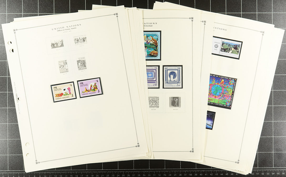 Mint (and some used) stamps on album and stock pages, in glassines, plus a couple of binders of presentation cards. Mostly pre-1990, with some duplication. Mostly New York, but some Vienna and Geneva offices. Lots of catalogue value. This was four bidboard lots at one time, plus some extra material. The balance of an estate. Estimate =
