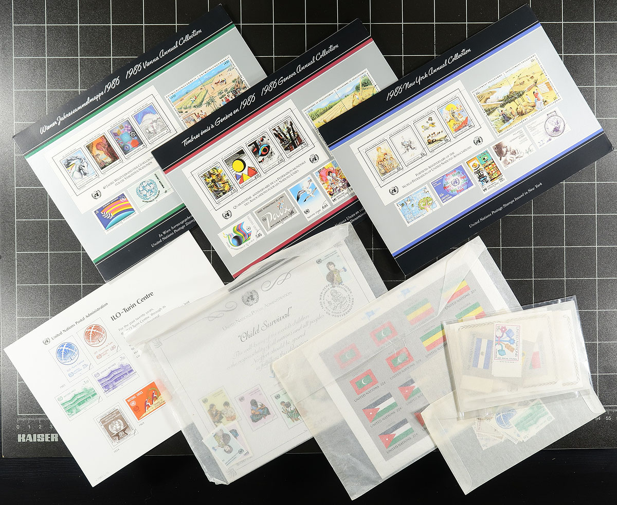 Mint (and some used) stamps on album and stock pages, in glassines, plus a couple of binders of presentation cards. Mostly pre-1990, with some duplication. Mostly New York, but some Vienna and Geneva offices. Lots of catalogue value. This was four bidboard lots at one time, plus some extra material. The balance of an estate. Estimate =