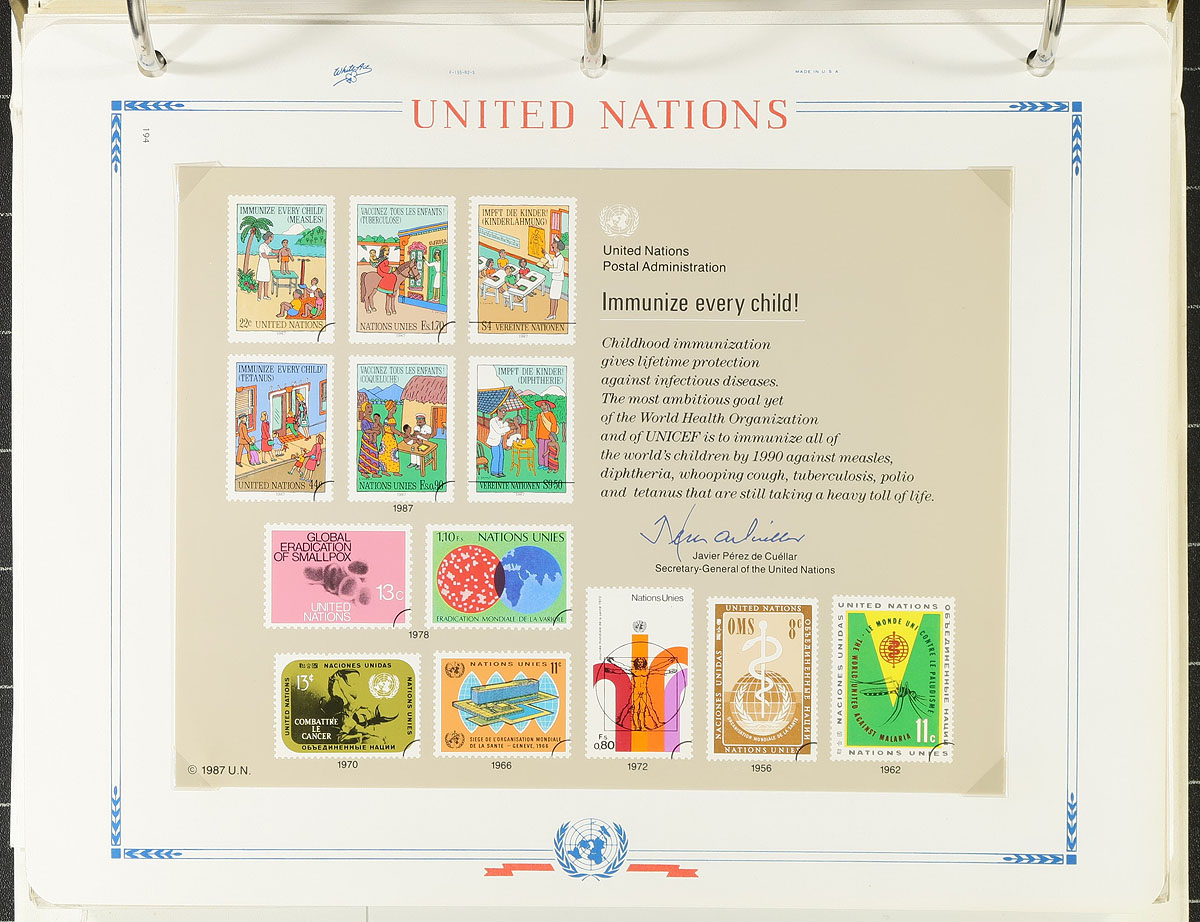Mint (and some used) stamps on album and stock pages, in glassines, plus a couple of binders of presentation cards. Mostly pre-1990, with some duplication. Mostly New York, but some Vienna and Geneva offices. Lots of catalogue value. This was four bidboard lots at one time, plus some extra material. The balance of an estate. Estimate =
