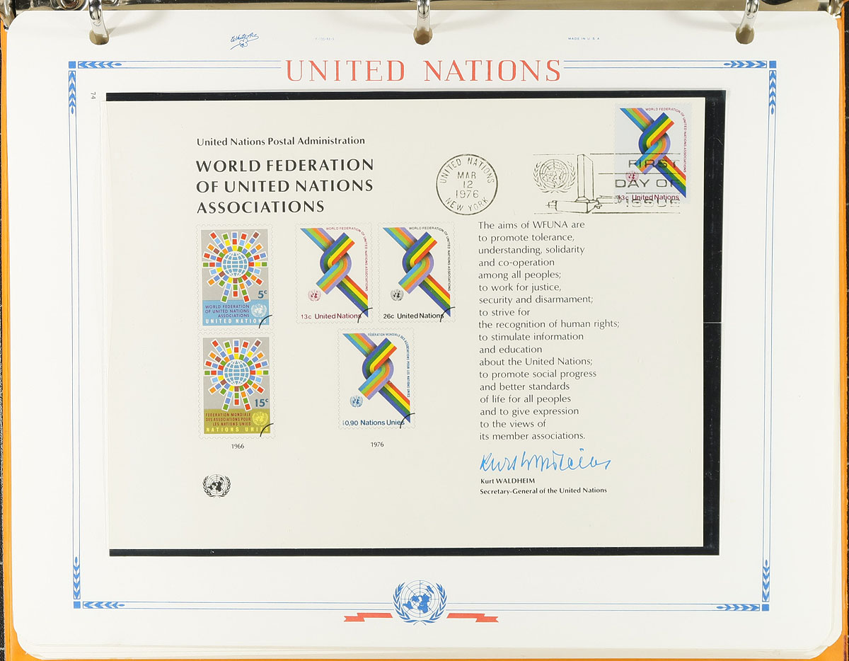 Mint (and some used) stamps on album and stock pages, in glassines, plus a couple of binders of presentation cards. Mostly pre-1990, with some duplication. Mostly New York, but some Vienna and Geneva offices. Lots of catalogue value. This was four bidboard lots at one time, plus some extra material. The balance of an estate. Estimate =