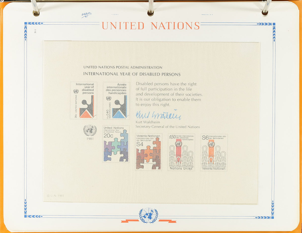 Mint (and some used) stamps on album and stock pages, in glassines, plus a couple of binders of presentation cards. Mostly pre-1990, with some duplication. Mostly New York, but some Vienna and Geneva offices. Lots of catalogue value. This was four bidboard lots at one time, plus some extra material. The balance of an estate. Estimate =