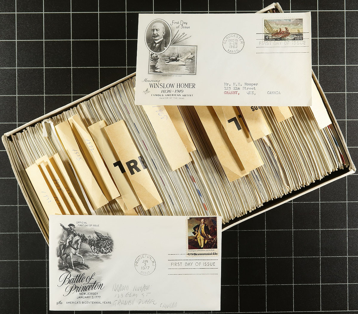 Cachet First Day Cover accumulation packed into three shoe boxes. Most are 1950's-1980's from a range of cachet makers (Artcraft, Fleetwood, Boll, Stephen Anderson & more). Over 1500 covers, and a bit of postal stationery, with little duplication. Almost all are #8 sized, all appear to have cachets and most from the late 1970's-1980's are unaddressed. Fills a bankers box. Well worth the estimate of 10c per cover. Estimate =