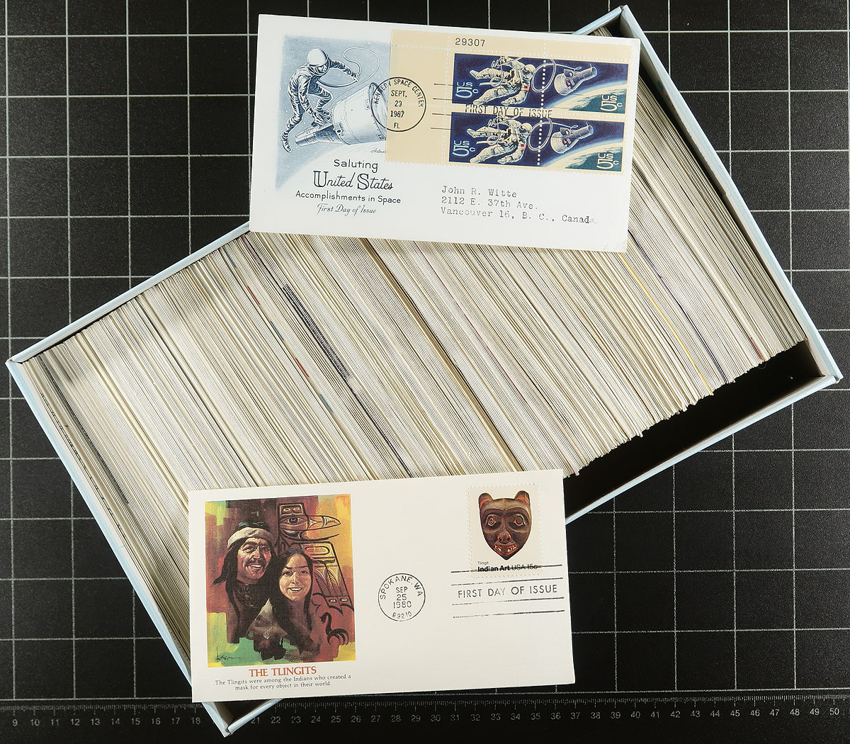 Cachet First Day Cover accumulation packed into three shoe boxes. Most are 1950's-1980's from a range of cachet makers (Artcraft, Fleetwood, Boll, Stephen Anderson & more). Over 1500 covers, and a bit of postal stationery, with little duplication. Almost all are #8 sized, all appear to have cachets and most from the late 1970's-1980's are unaddressed. Fills a bankers box. Well worth the estimate of 10c per cover. Estimate =