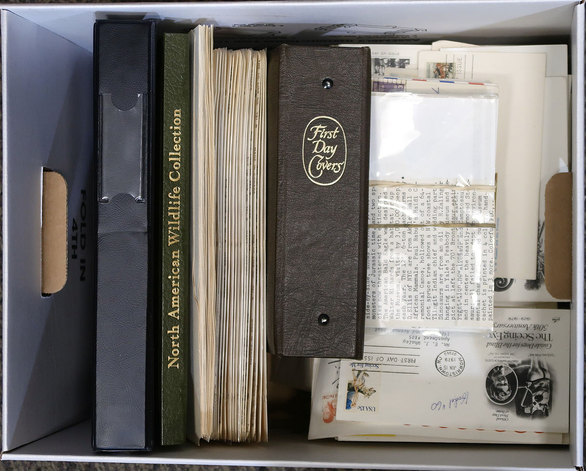 Bankers box full of cacheted First Day Covers, most 1960-early 1990's. This accumulation is from a number of sources and is the balance of an estate. This means there are a number of cachet makers, with Fleetwood, Artcraft, Artmaster, with some Colorano "Silks", and other "one-offs" throughout. Includes quantities of the 20c and 22c "flowers and birds", but generally duplication is light and there is lots to plough through. Estimate =