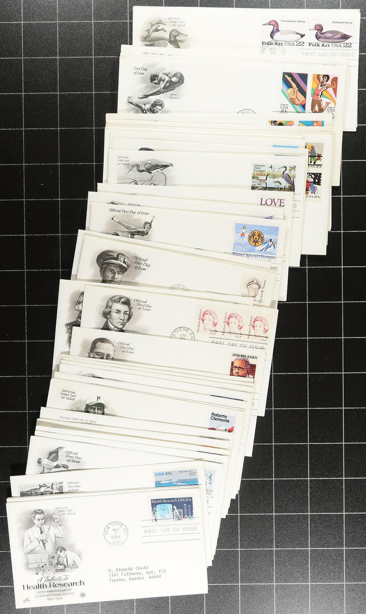 Bankers box full of cacheted First Day Covers, most 1960-early 1990's. This accumulation is from a number of sources and is the balance of an estate. This means there are a number of cachet makers, with Fleetwood, Artcraft, Artmaster, with some Colorano "Silks", and other "one-offs" throughout. Includes quantities of the 20c and 22c "flowers and birds", but generally duplication is light and there is lots to plough through. Estimate =