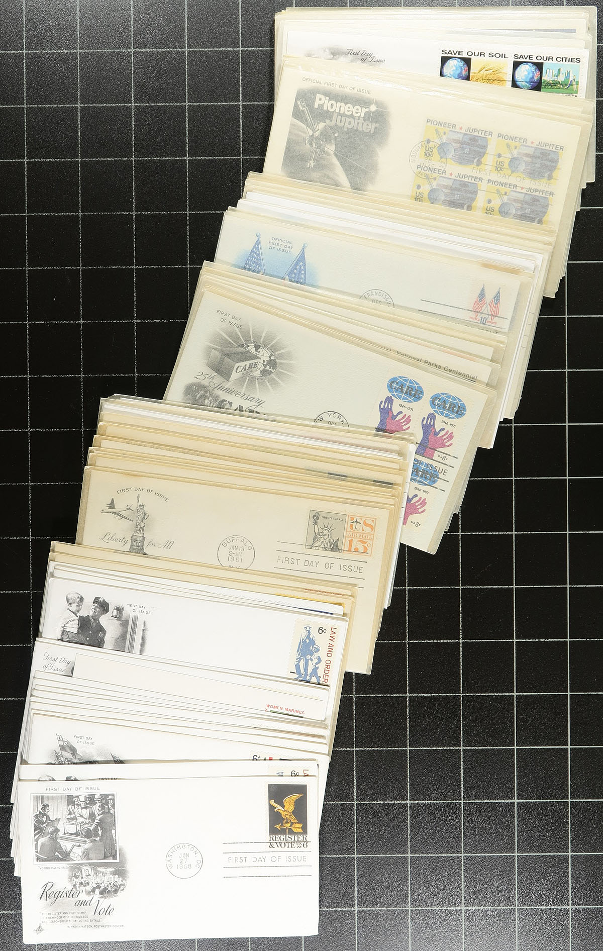 Bankers box full of cacheted First Day Covers, most 1960-early 1990's. This accumulation is from a number of sources and is the balance of an estate. This means there are a number of cachet makers, with Fleetwood, Artcraft, Artmaster, with some Colorano "Silks", and other "one-offs" throughout. Includes quantities of the 20c and 22c "flowers and birds", but generally duplication is light and there is lots to plough through. Estimate =