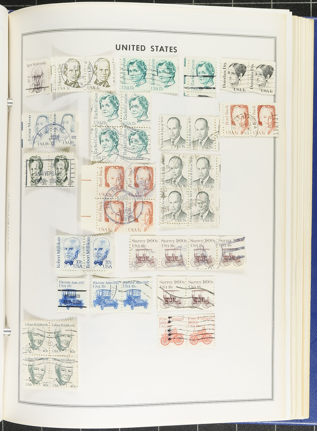 A mixed U-Haul box with the balance of an estate. Includes 44 different "Souvenir Panels" produced for philatelic and numismatic shows (1968-1975), a couple of mounted postal stationery collections (mint and some FDC, 1960-1975) including a 2-post Scott Specialty binder. There is a study of cancels from Oregon and Pennsylvania (mostly later 20th century) and a few album fragments with mint and used (mostly 1970-1990), year folders for 1991-1993 and a couple of books with complete sheets for the "Wildflower" and "Birds" issues circa 1988. Happy hunting! Estimate =