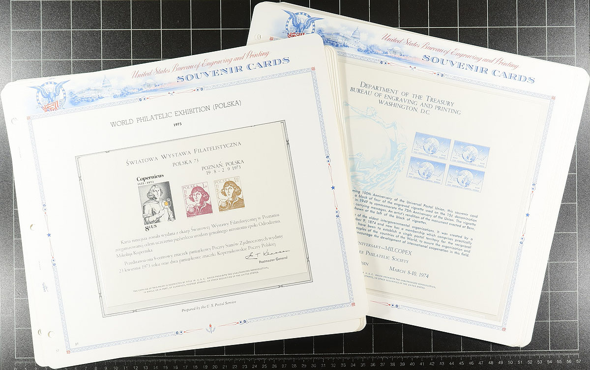 A mixed U-Haul box with the balance of an estate. Includes 44 different "Souvenir Panels" produced for philatelic and numismatic shows (1968-1975), a couple of mounted postal stationery collections (mint and some FDC, 1960-1975) including a 2-post Scott Specialty binder. There is a study of cancels from Oregon and Pennsylvania (mostly later 20th century) and a few album fragments with mint and used (mostly 1970-1990), year folders for 1991-1993 and a couple of books with complete sheets for the "Wildflower" and "Birds" issues circa 1988. Happy hunting! Estimate =