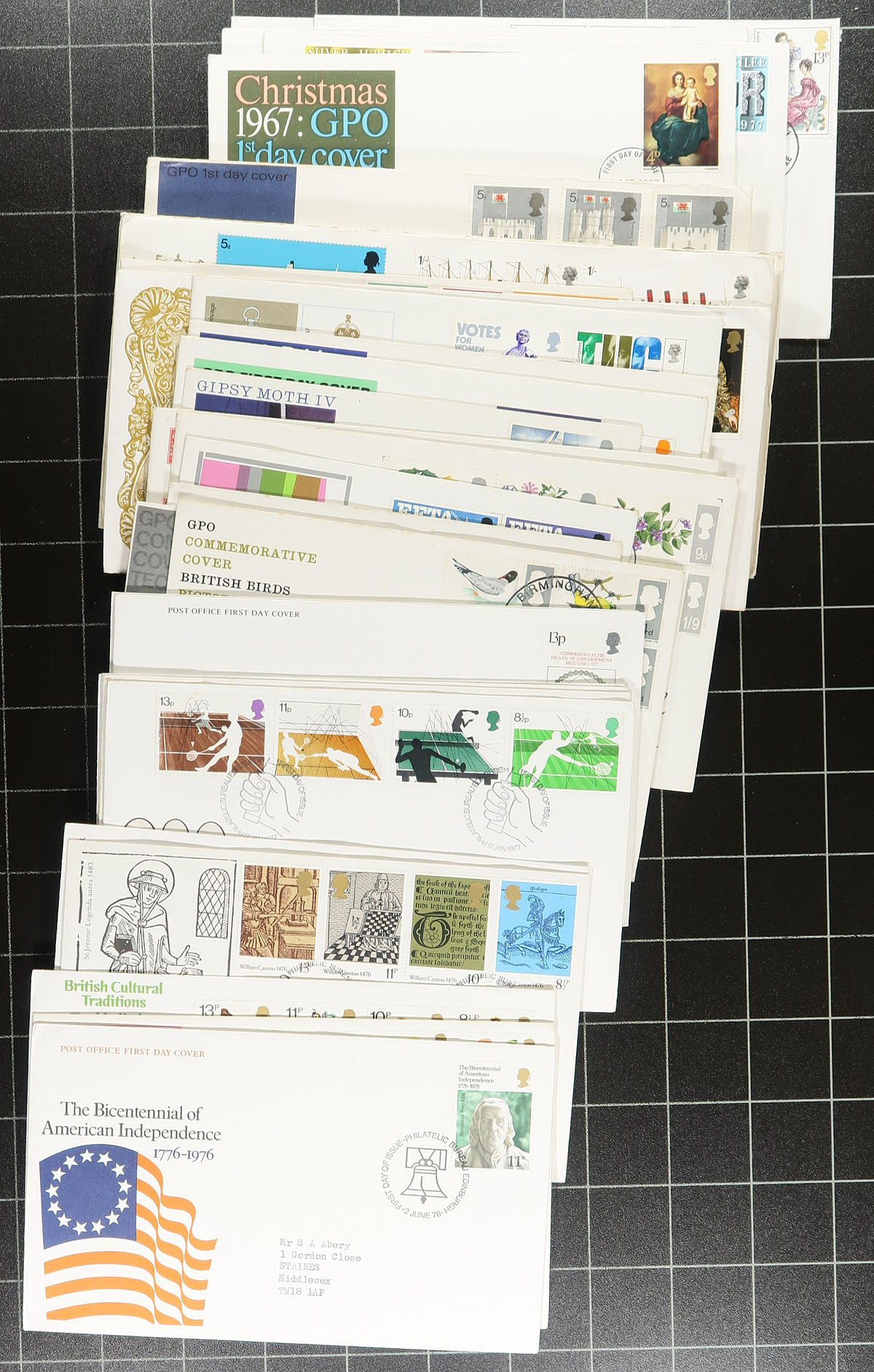 First Day Cover holding of a couple hundred cacheted FDCs in a medium-sized box. A mix of addressed and unaddressed items, from throughout of the British Isles, including Great Britain (mostly 1965-1980, with a nice group of 23 different 1966 cachets). There is a handful of "Regionals" issued 1971-1990. The group finishes with another handful of Isle of Man and Guernsey, plus likely more that we have not mentioned. Substantial catalogue value here. Estimate =