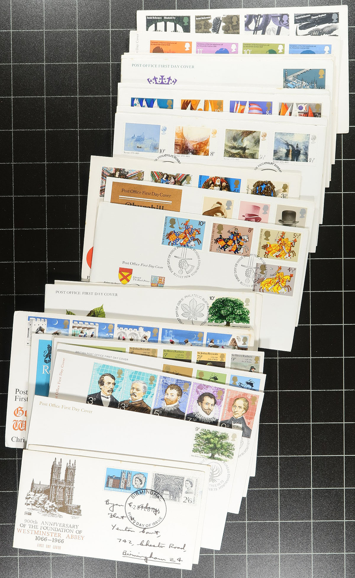 First Day Cover holding of a couple hundred cacheted FDCs in a medium-sized box. A mix of addressed and unaddressed items, from throughout of the British Isles, including Great Britain (mostly 1965-1980, with a nice group of 23 different 1966 cachets). There is a handful of "Regionals" issued 1971-1990. The group finishes with another handful of Isle of Man and Guernsey, plus likely more that we have not mentioned. Substantial catalogue value here. Estimate =