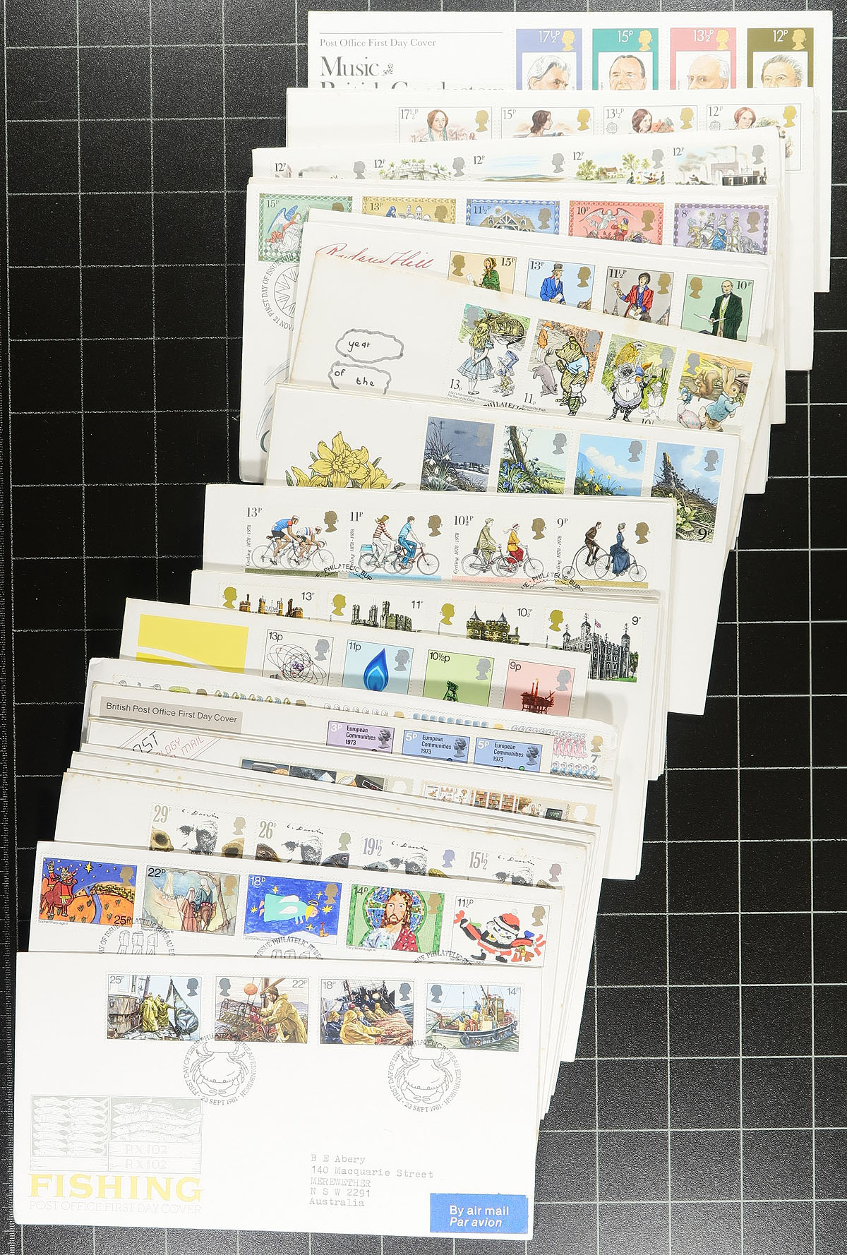 First Day Cover holding of a couple hundred cacheted FDCs in a medium-sized box. A mix of addressed and unaddressed items, from throughout of the British Isles, including Great Britain (mostly 1965-1980, with a nice group of 23 different 1966 cachets). There is a handful of "Regionals" issued 1971-1990. The group finishes with another handful of Isle of Man and Guernsey, plus likely more that we have not mentioned. Substantial catalogue value here. Estimate =