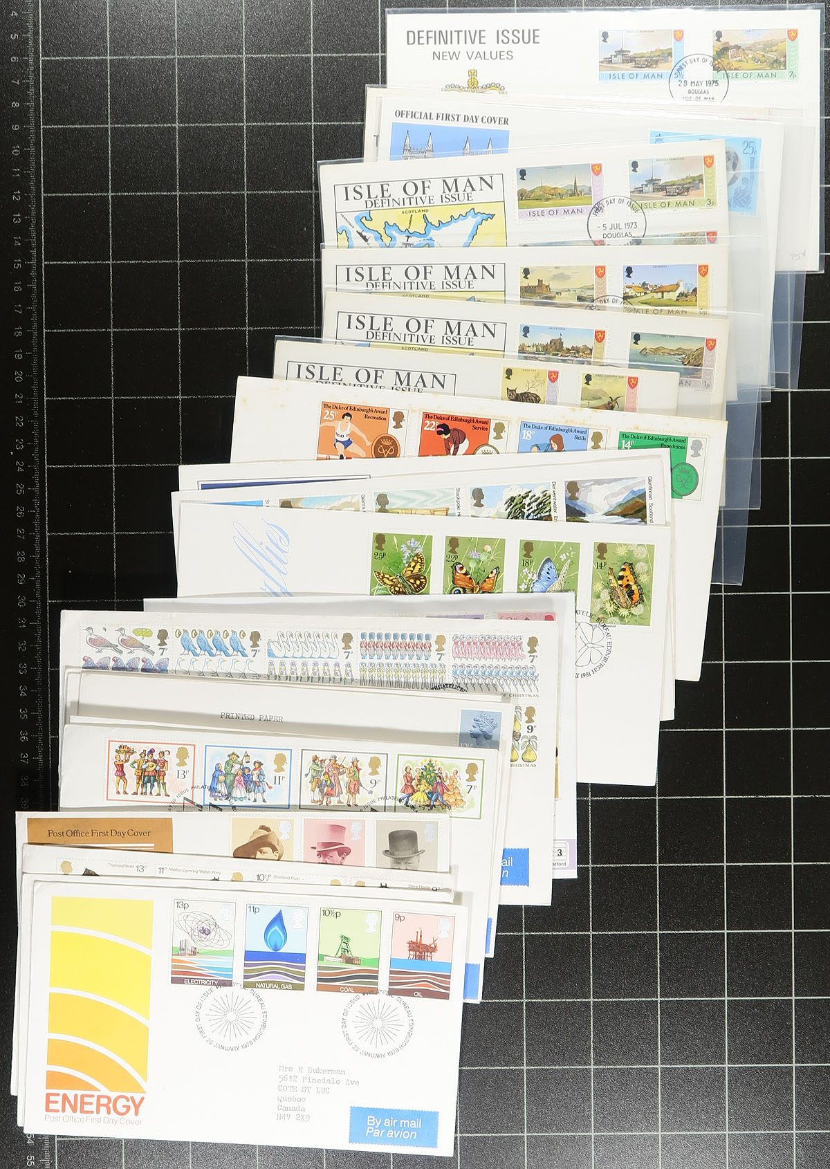 First Day Cover holding of a couple hundred cacheted FDCs in a medium-sized box. A mix of addressed and unaddressed items, from throughout of the British Isles, including Great Britain (mostly 1965-1980, with a nice group of 23 different 1966 cachets). There is a handful of "Regionals" issued 1971-1990. The group finishes with another handful of Isle of Man and Guernsey, plus likely more that we have not mentioned. Substantial catalogue value here. Estimate =