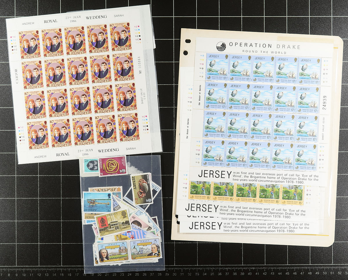 This collector loved the Channel Isle of Jersey and bought it at every turn. While this selection was acquired, the organization is up to you. Includes a big bag of album, stock and approval pages, plus more. About 2/3 is mint, the rest used. Mostly pre-2000, with a mix of singles, sets, souvenir sheets, booklets, sheetlets, etc. Condition is high and duplication is to be expected. A few non-Jersey items are likely included in the mix. Substantial catalogue value here. Estimate =