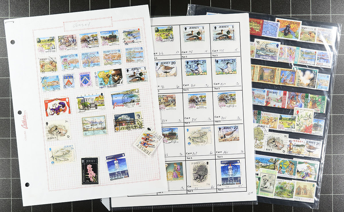 This collector loved the Channel Isle of Jersey and bought it at every turn. While this selection was acquired, the organization is up to you. Includes a big bag of album, stock and approval pages, plus more. About 2/3 is mint, the rest used. Mostly pre-2000, with a mix of singles, sets, souvenir sheets, booklets, sheetlets, etc. Condition is high and duplication is to be expected. A few non-Jersey items are likely included in the mix. Substantial catalogue value here. Estimate =