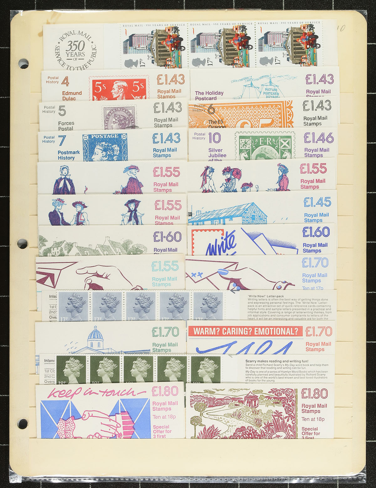 Complete booklets (over 60 mostly different, plus an early QEII blank cover "convenience" booklet), a few presentation folders and a set of King George VI training stamps. A few of the larger booklets are "Prestige" style. Lots of catalogue and original face value here. Condition is well above average. Estimate =