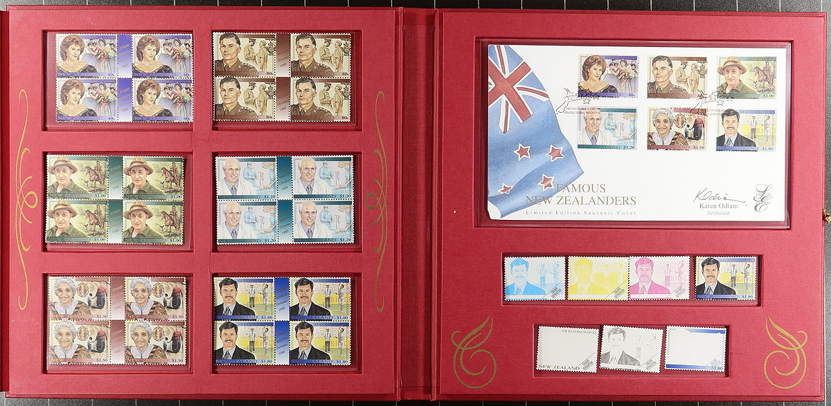 A quintet of "Limited Edition" albums issued 1995-2001, with volumes III-V (Maori Language, Rugby League, Famous New Zealanders) and XX-XXI (Garden Flowers and Aircraft). These were limited in production to 2000 copies each and some have items not released elsewhere (e.g. production "proofs", imperforates). Not often seen, due to their original cost of NZ$135.00 each. All come in their matching slipcover and are in excellent condition. Original post office cost NZ$675.00 = $540.00 CDN. Estimate =