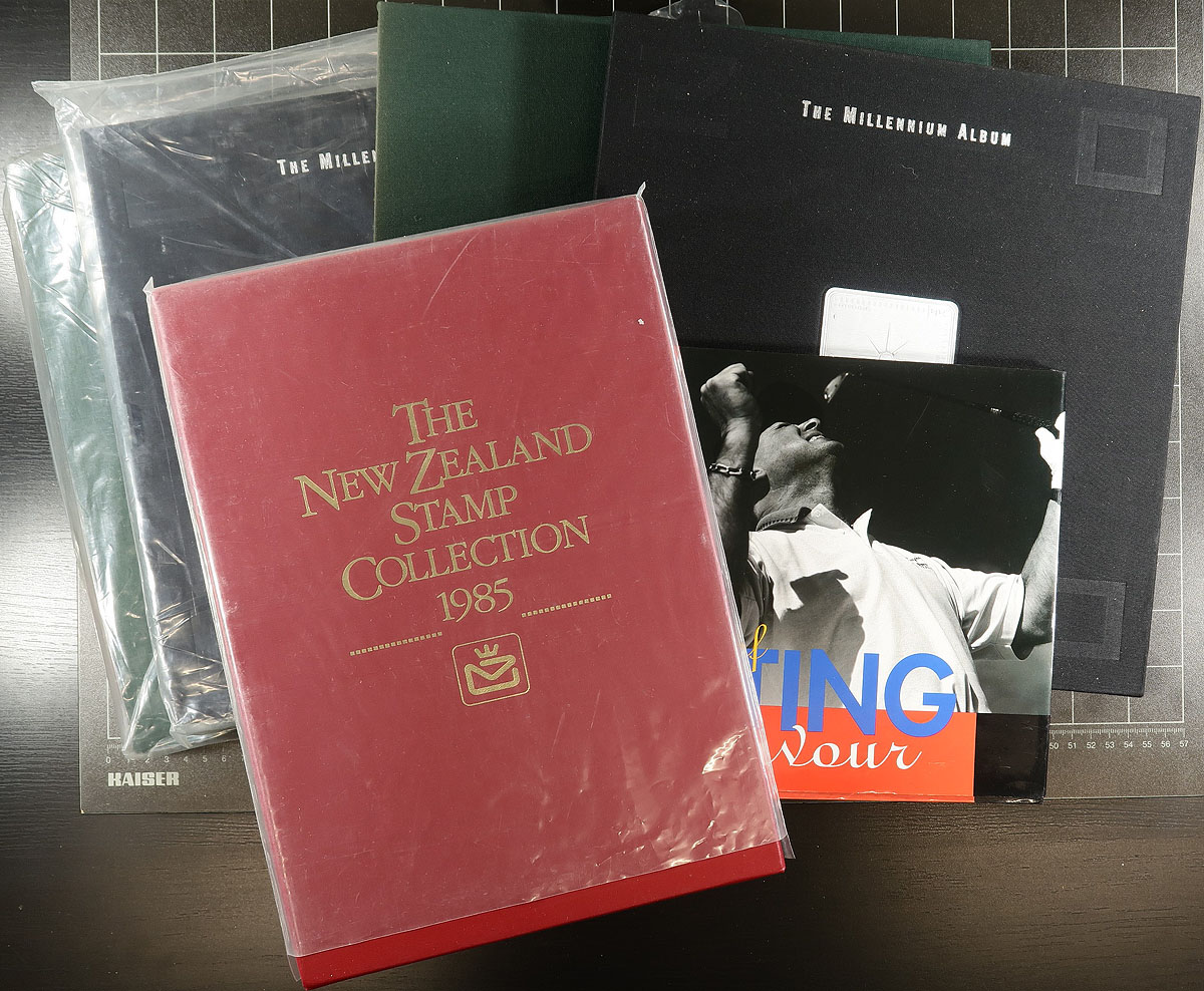 Post Office issued Collections, the balance of an estate. Includes two copies each of the 1990 - 150th anniversary and the 2000 Millennium albums, plus singles of the 1985 annual collection and the 1996 book on "Sporting Endeavour". All in decent condition with all of the stamps intact. The Millennium collection has a series of souvenir sheets that are only available in this format. The original cost was over NZ$450.00. Estimate =