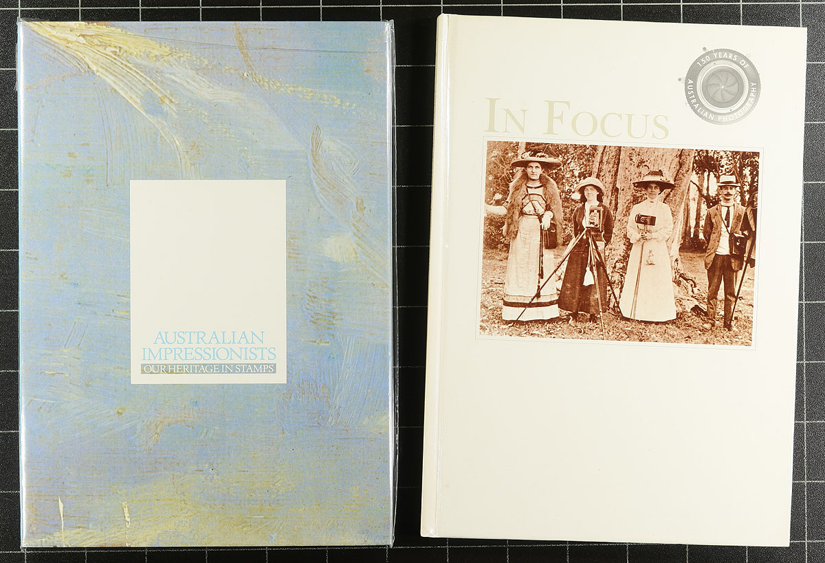 One of Australia Post’s interesting product launches, starting in the 1970's, was the release of hardcover books (like an annual collection) but only for a single issue (often four stamps and/or a souvenir sheet). They included an inserted presentation folder in the package and often charged A$15.00 each for these products. Presumably they were aimed at non-collectors or people looking for a gift for collectors, but they never seemed to be commercially successful as they were largely overlooked by the philatelic community at the time. Skip ahead a few decades and collectors realize how few of these exist (plus their weight to stamp value makes shipping single volumes untenable). This banker’s box includes 11 full sized books, six smaller sized, three soft-cover booklets a folder with a limited edition print for the "Waterbirds of Australia" and three of the "Collector’s Yearbooks" from 1990-1993 (these have Framas, booklets and self-adhesives). Substantial original cost and frankly, not a lot of postage value. Estimate =